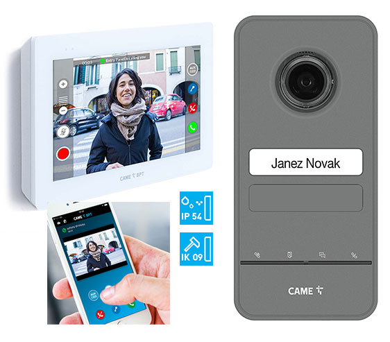 Vgrajena visoko resolucijska kamera z resolucijo 728x560 pikslov s kotom snemanja 98° vodoravno in 72° navpično. Na voljo sta dva izhoda za električno ključavnico in dodatno krmiljenje (drsna vrata). Omogoča nastavitev časa odpiranja električne ključavnice. Osvetljena tipka z napisnim liskom